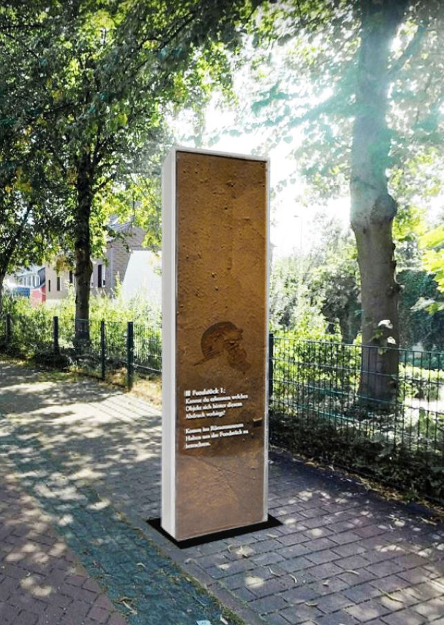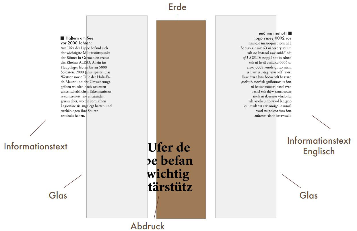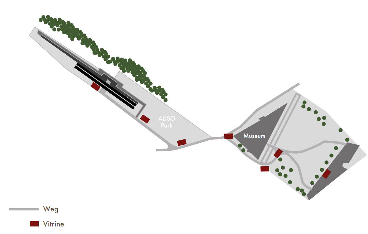 Draußen platzierte Vitrinen zeigen die aus dem Boden stammenden Informationen und bilden ein Leitsystem.